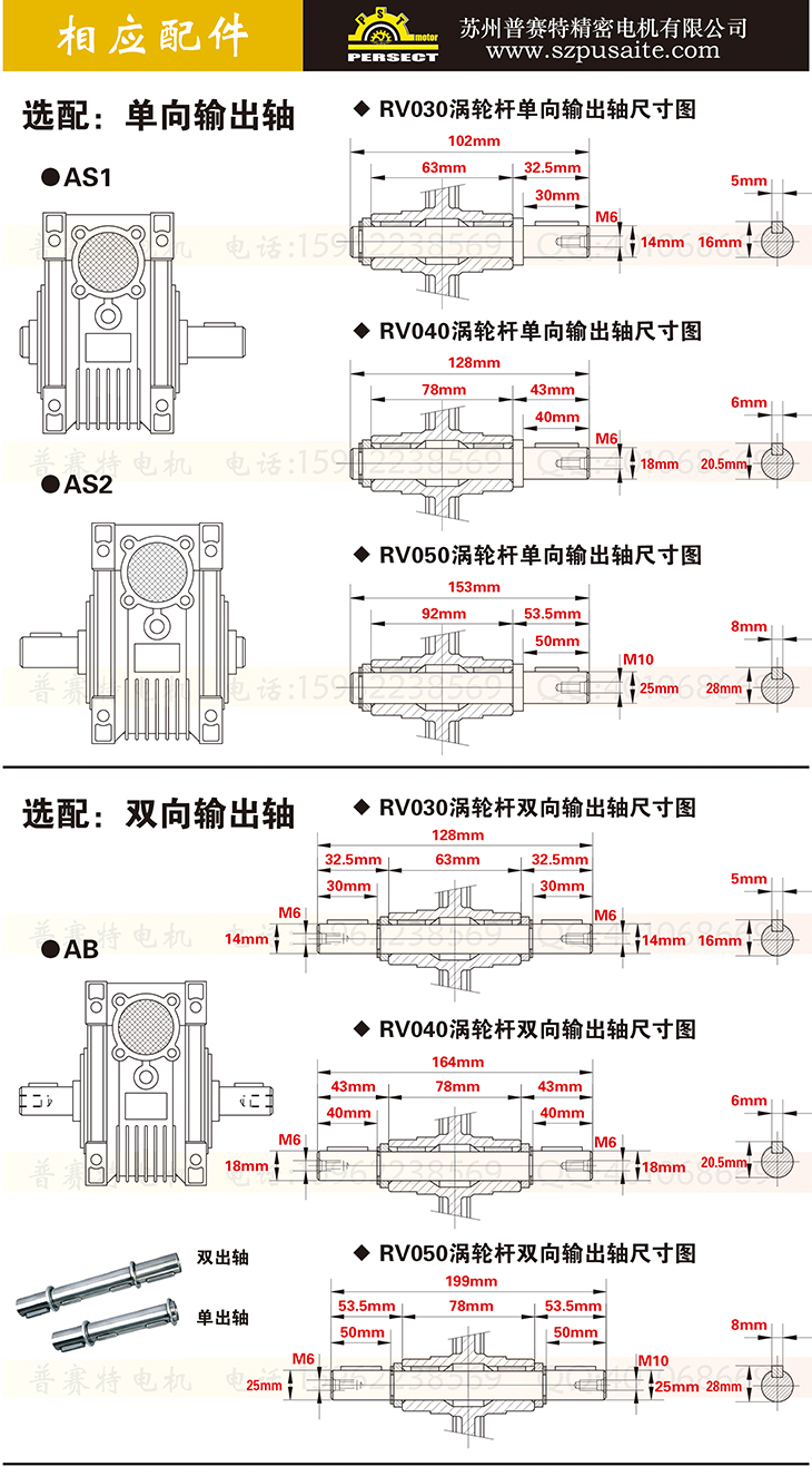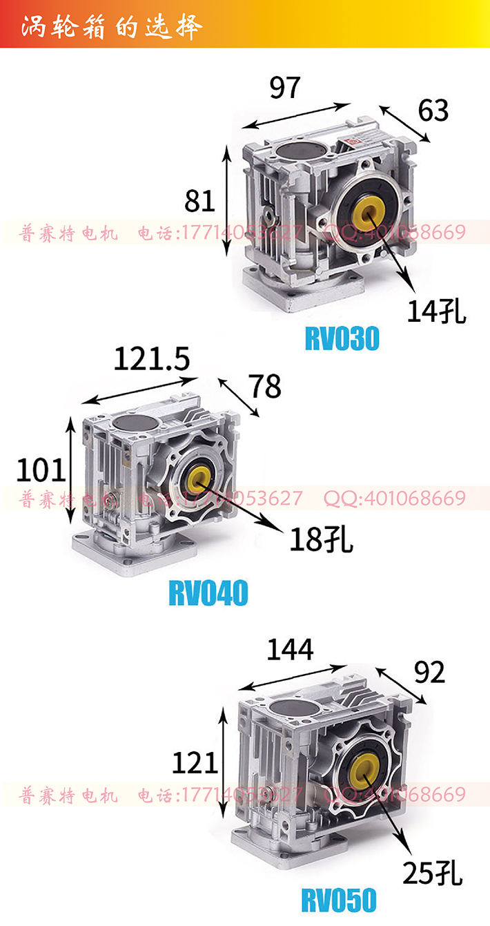 交流电机配蜗轮蜗杆减速机, 电机功率有:60W、90W、120W、140W、180W、200W、250W,电压标配220V和380V,标准转速1400转,涡轮箱可配RV030(减速比5、7.5、10、15、20、25、30、40、50、60、80),RV040(减速比5、7.5、10、15、20、25、30、40、50、60、80、100),RV050(减速比5、7.5、10、15、20、25、30、40、50、60、80、100)