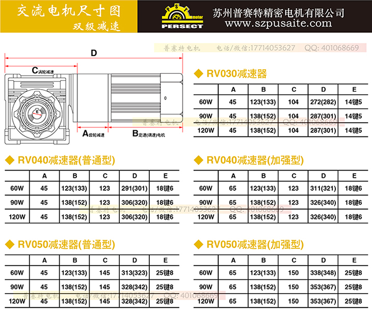 交流电机配齿轮减速加蜗轮蜗杆双级减速机,电机外径90*90, 电机功率有:60W、90W、120W,电压标配220V和380V,标准转速1400转.涡轮箱可配RV030(减速比5、7.5、10、15、20、25、30、40、50、60、80),RV040(减速比5、7.5、10、15、20、25、30、40、50、60、80、100),RV050(减速比5、7.5、10、15、20、25、30、40、50、60、80、100)